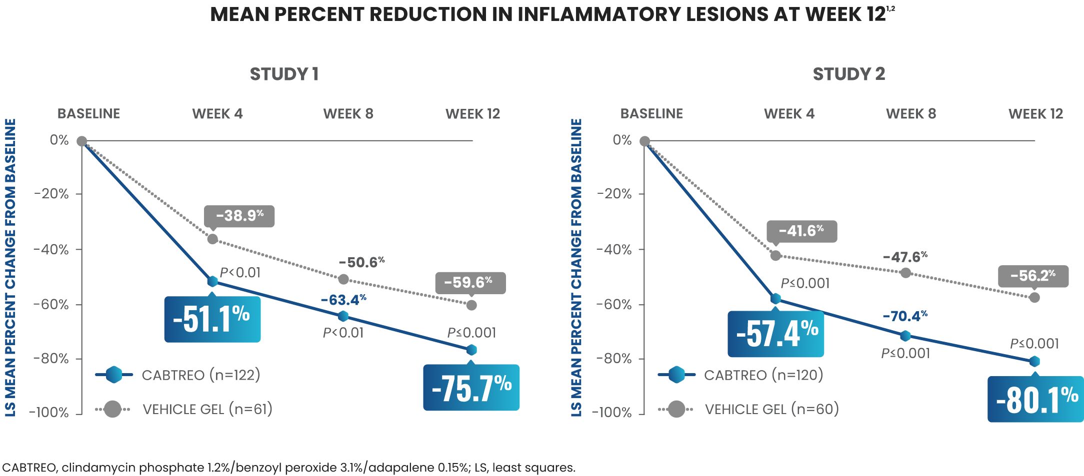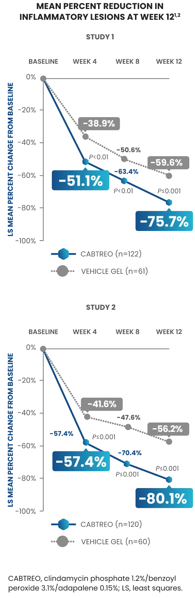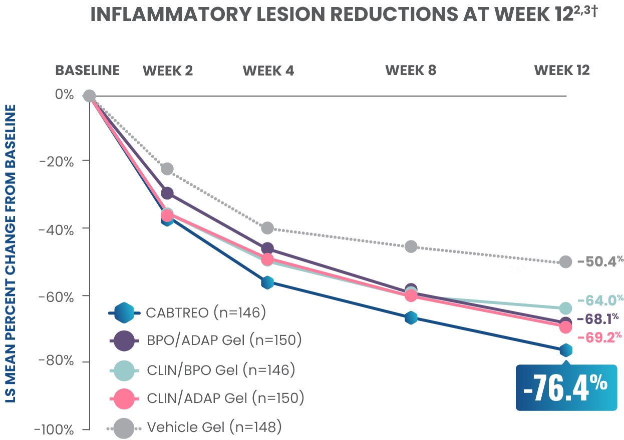 PRIMARY ENDPOINT: Mean absolute reduction in inflammatory lesions with CABTREO Gel was -28 vs -22 with vehicle in study 1 and -30 vs -21 with vehicle in study 2 (P≤0.001 in both trials)1,2