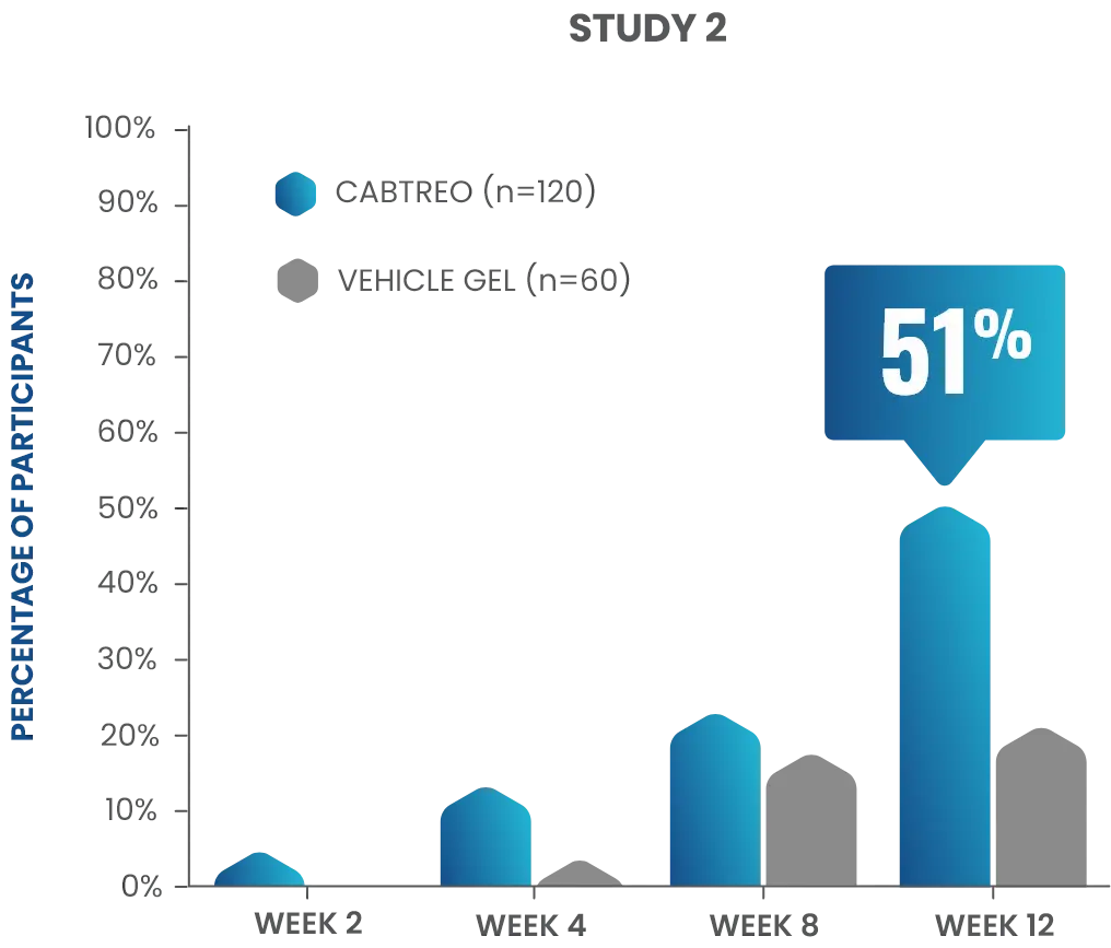 - In study 2, 51% of patients receiving CABTREO (n=120) achieved treatment success* vs 21% of those receiving vehicle (n=60)1,2