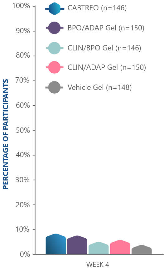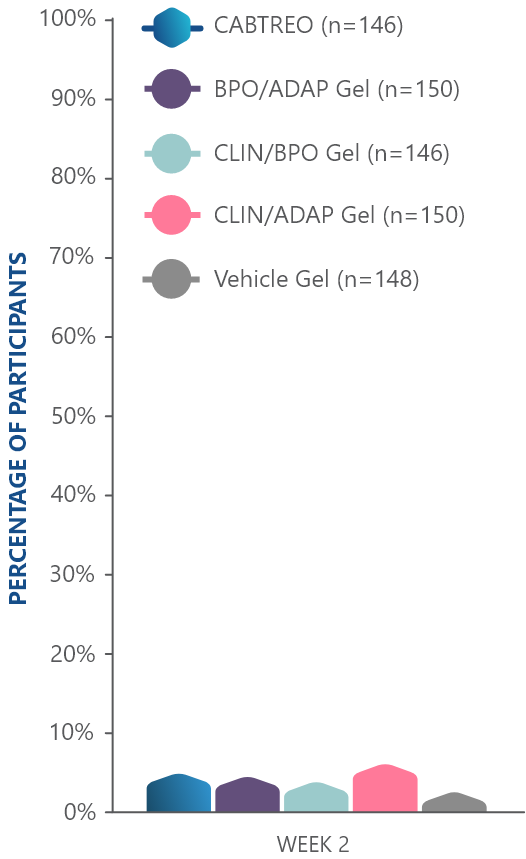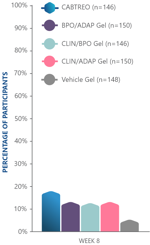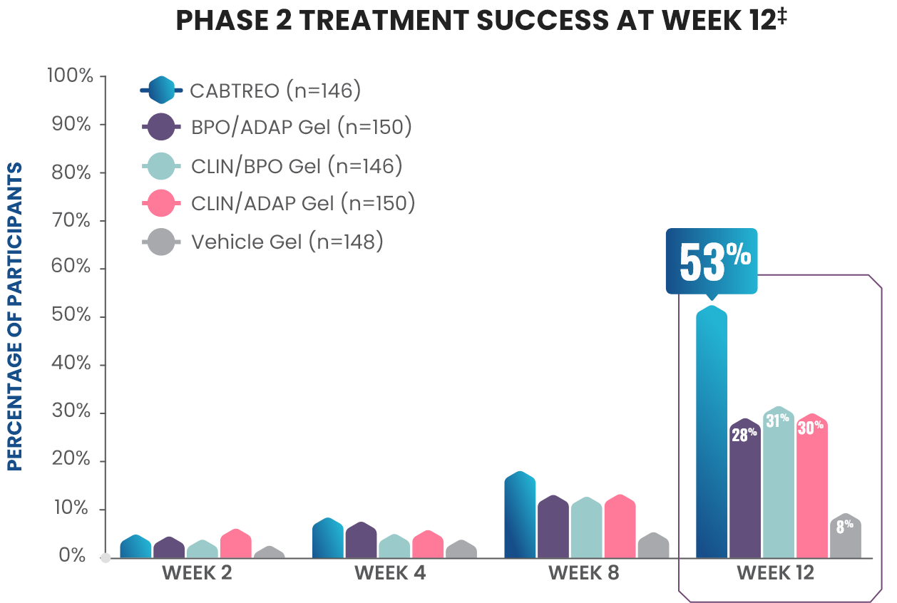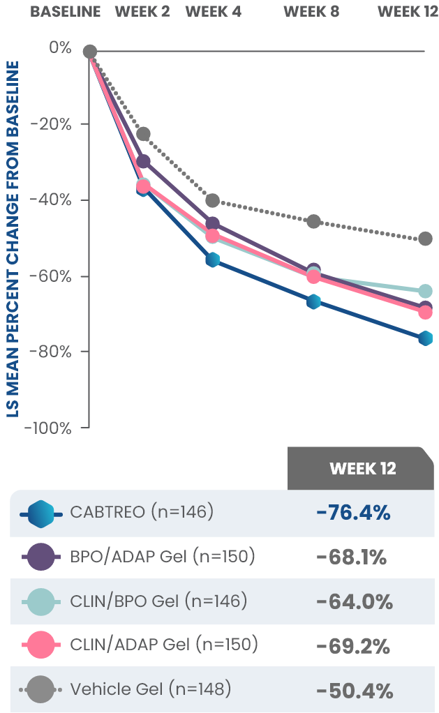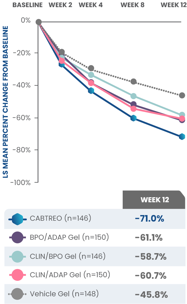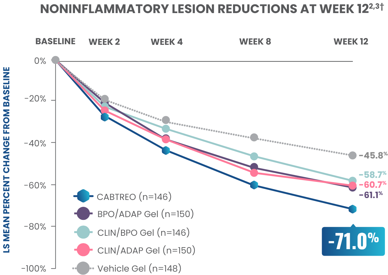 PRIMARY ENDPOINT: Mean absolute reduction in noninflammatory lesions with CABTREO Gel was -35 vs -24 with vehicle in study 1 and -35 vs -22 in study 2 (P≤0.001 in both trials)1,2